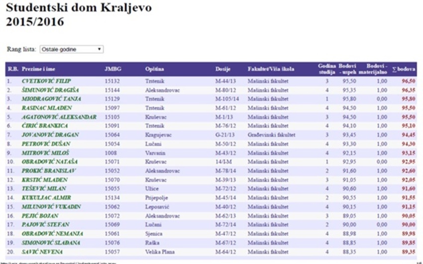 Ovo je konačna rang-lista kandidata ostalih godina. Primljeni su kandidati zaključno sa red.br. 110 (stodeset). Useljenje primljenih kandidata je 1,2,3 i 4.12.2015.Prilikom useljenja potrebno je lekarsko uverenje( ne starije od 30 dana) i uplata stanarine za decembar 2015.g. Kandidati koji se ne usele u naznačenom periodu, smatraće se odustalim od stanovanja u domu. Konačnu rang listu možete preuzeti ovde