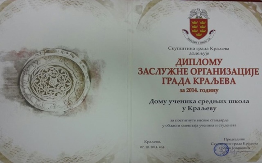 Nakon Svetosavske nagrade, naš dom je ovih dana dobio još jedno priznanje. Za postignute visoke standarde u oblasti smeštaja i ishrane učenika i studenata Dom učenika srednjih škola Kraljevo dobitnik je ovogodišnje Oktobarske nagrade Grada Kraljeva. Grad Kraljevo svakog 7.oktobra, na Kraljevdan, svečano dodeljuje nagrade i diplome pojedincima i ustanovama. Obeležavanjem Kraljevdana naš grad od 1998.godine neguje kult dinastije Nemanjića, sećanjem na 7.oktobar 1226.godine, kada se upokojio prvi srpski kralj Stefan Prvovenčani.